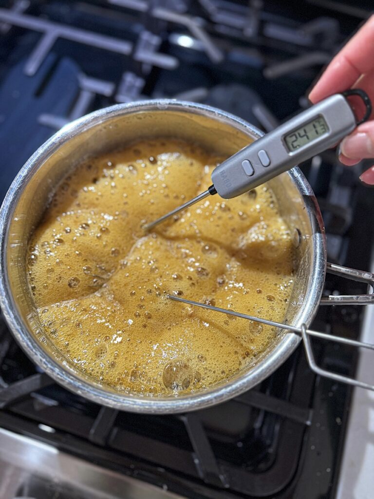 - In a medium pot, combine 1/2 cup water and 1 cup maple syrup or honey and bring them to a boil over medium/high heat for about 15-20 minutes until a candy thermometer reads 240° F. **watch carefully and don't walk away. Too high of heat can boil the sugar mixture over. If it begins to foam up, just whisk it back down. Helpful Tip: It takes a while to break 220°F. Have patience, because once it does, the temperature increases rapidly to 240°F.