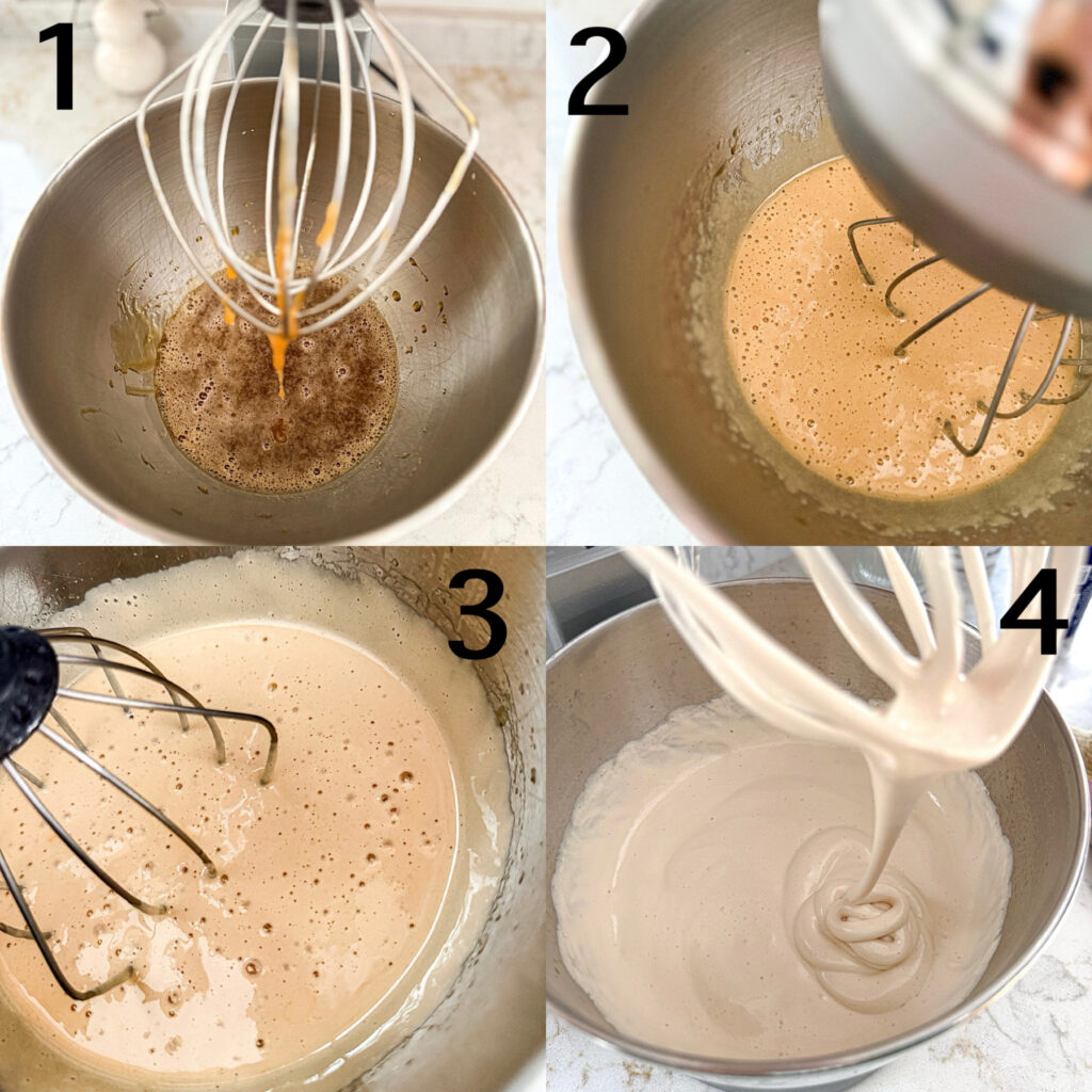 - Remove from heat and start your mixer on low speed to break up the hardened gelatin below. Continue mixing while slowly adding in the hot sweetener from the pot. Add in the vanilla next. Then increase the speed to high and whip everything for about 5 minutes. The mixture will triple and go from a caramel color to a glossy, fluffy off white color. *Finished Ribbon Test: Pull up whisk and if the mixture falls into a thick, slow moving ribbon holding it's shape for a few seconds, it is finished. (see post for pictures)