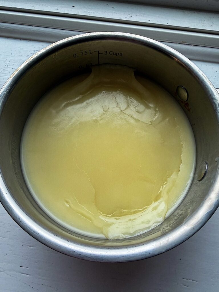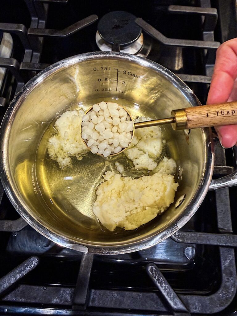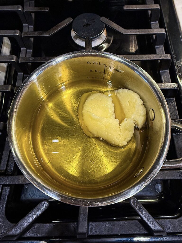 - Gently Melt Tallow: Over low heat in a small saucepan, gently melt the beef tallow into a liquid. Add in beeswax pellets and melt them completely then remove from the heat.
