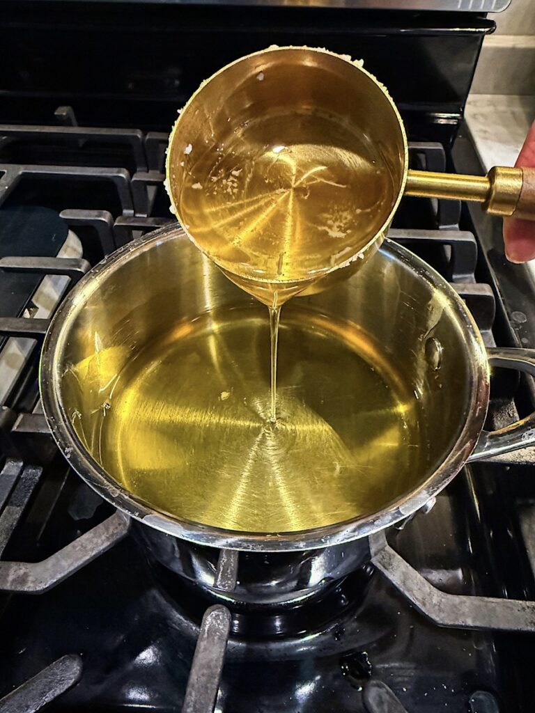 Step two is melting down the tallow on the stove top. Then adding in a carrier oil such as jojoba, olive or castor oil. My favorite is castor oil for it’s deeply nourishing properties!