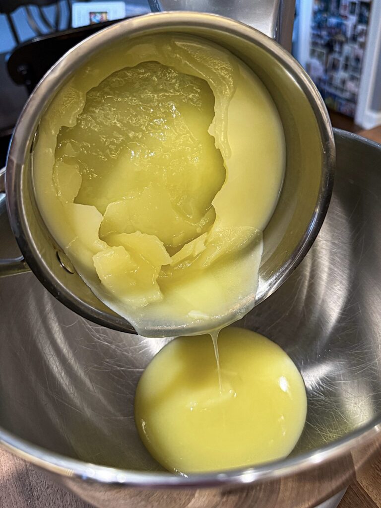 It is made from beef fat that has been rendered down and purified. Depending on how many cycles of purification it goes through, it will either be scent free or slightly still carry a fatty scent to it. Which can be masked by adding in essential oils, but more on that later.