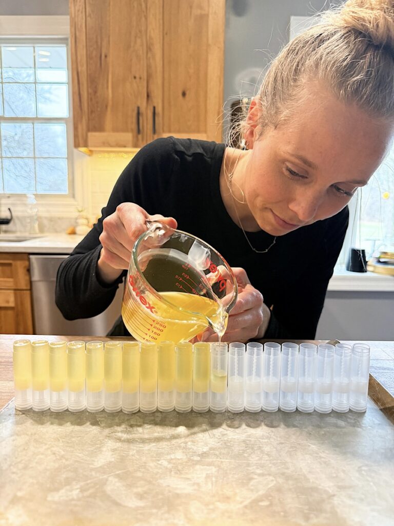 - Pour into Molds: Carefully pour liquid into chapstick molds and allow mixture to harden before moving and adding covers.